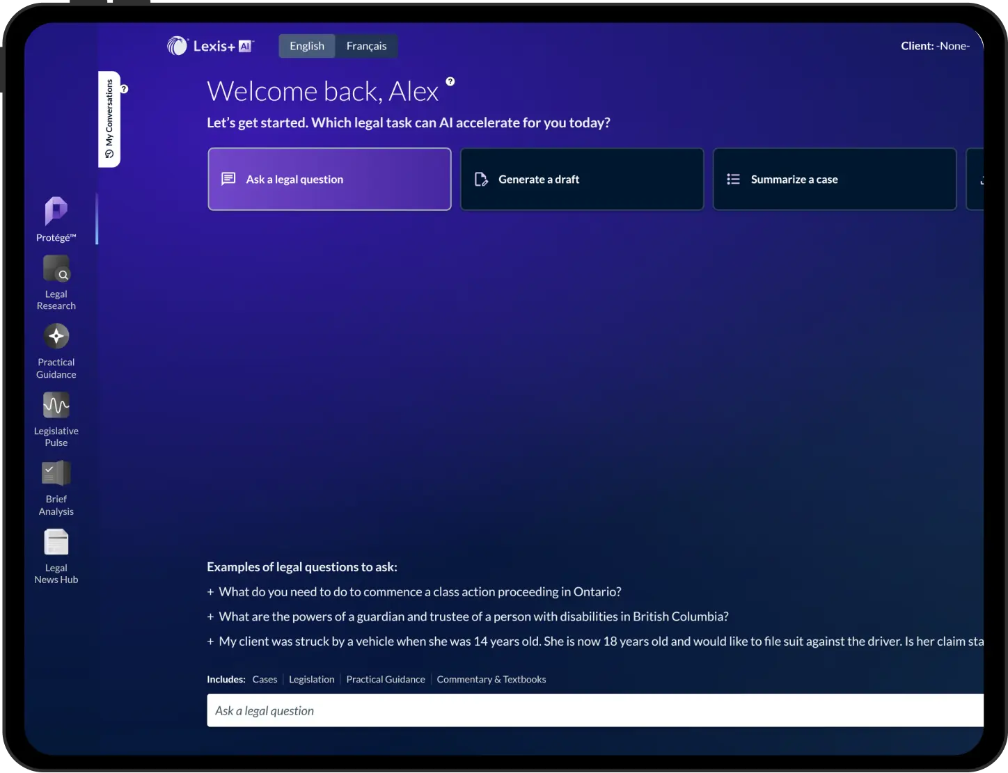 It combines the power of Protégé™, a personalized AI assistant, with authoritative LexisNexis content to help legal professionals make informed decisions faster and deliver outstanding work.